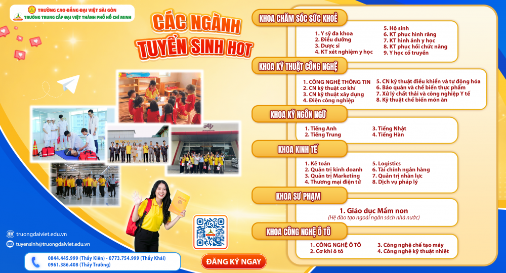 Trường Cao đẳng Đại Việt Sài Gòn Cơ sở Thủ Đức thông báo tuyển sinh hệ Cao đẳng và Trung cấp năm 2026 với nhiều ngành nghề đa dạng, đáp ứng nhu cầu học tập và xu hướng thị trường lao động hiện nay.