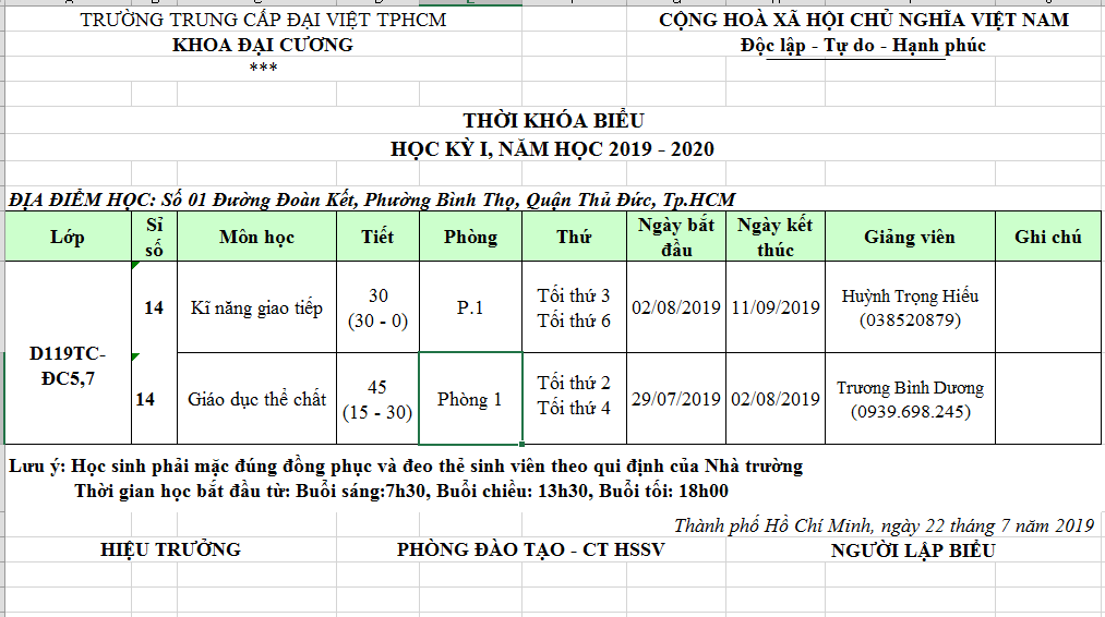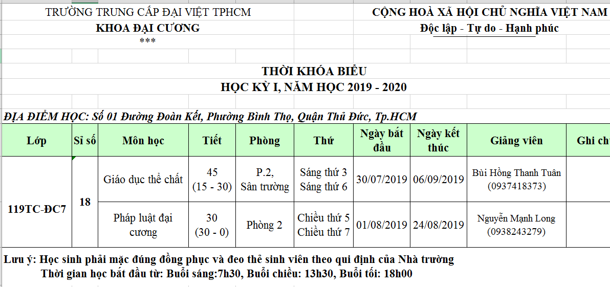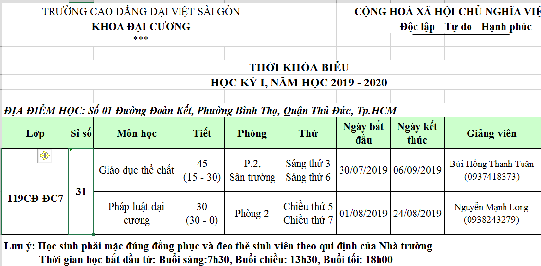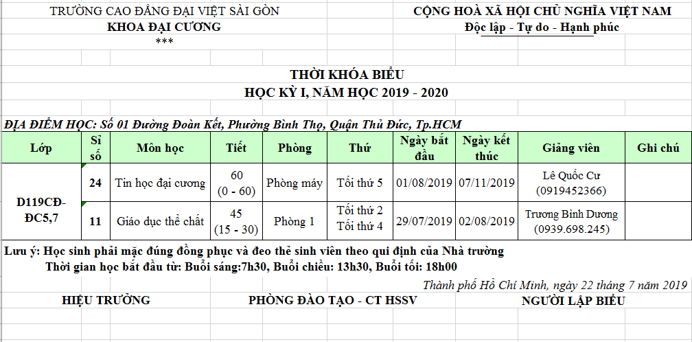 Lịch học các môn đại cương hệ CĐ, TC, lớp ngày và lớp đêm
