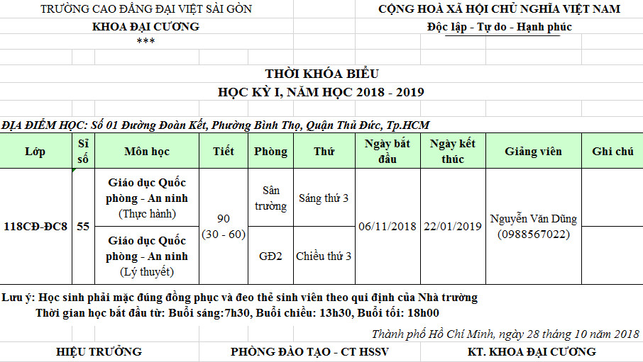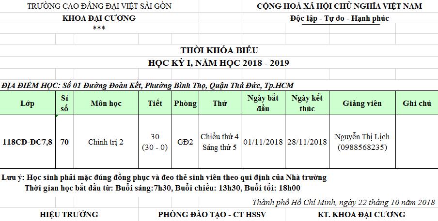 Lịch học CHÍNH TRỊ 2 và GD QUỐC PHÒNG AN NINH lớp CĐ ngày.