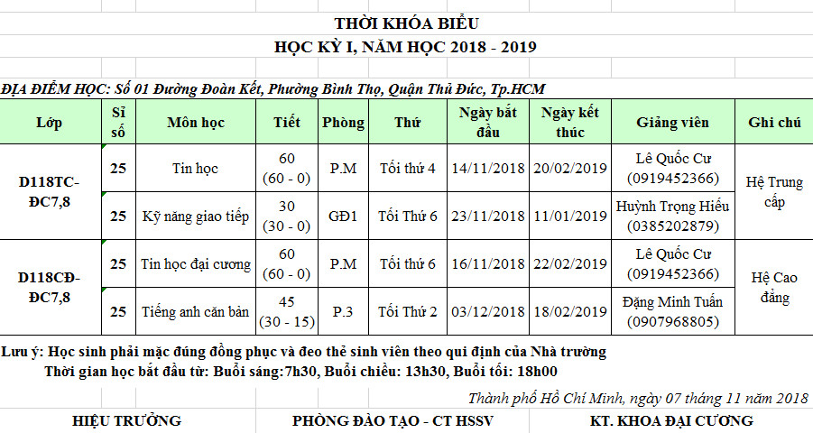 Lịch học KNGT, Tin học Hệ Trung cấp & Tin học, anh văn hệ Cao Đẳng
