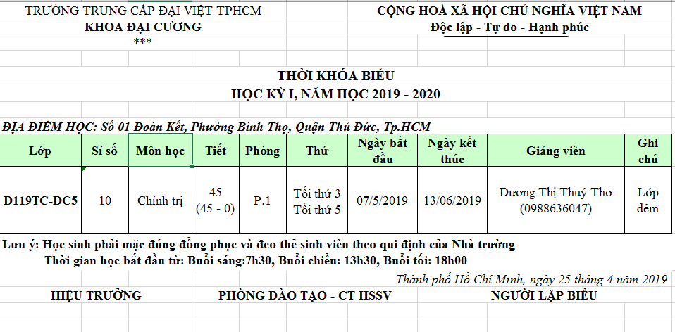Lịch học môn Chính trị hệ Trung cấp ban đêm khóa mới
