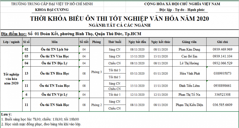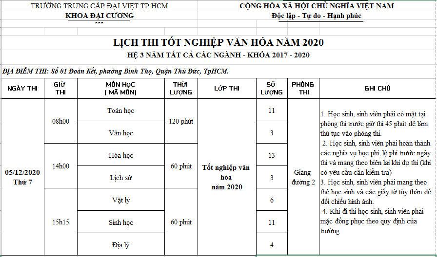 Lịch ôn thi tốt nghiệp văn hóa