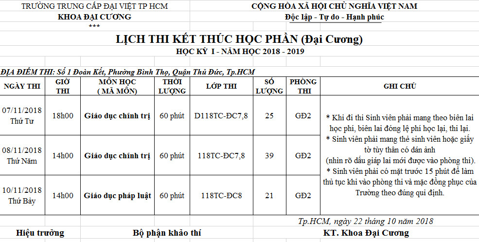 Lịch thi Giáo dục Chính trị và Giáo dục Pháp luật hệ Trung cấp