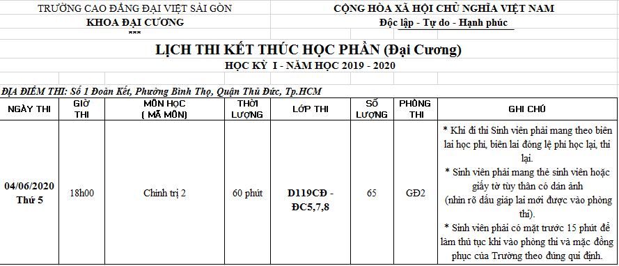 Lịch thi môn Chính trị 2, hệ Cao đẳng, lớp đêm