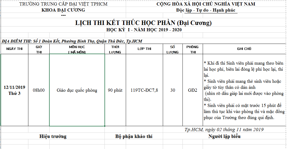 Lịch thi QPAN hệ Trung cấp