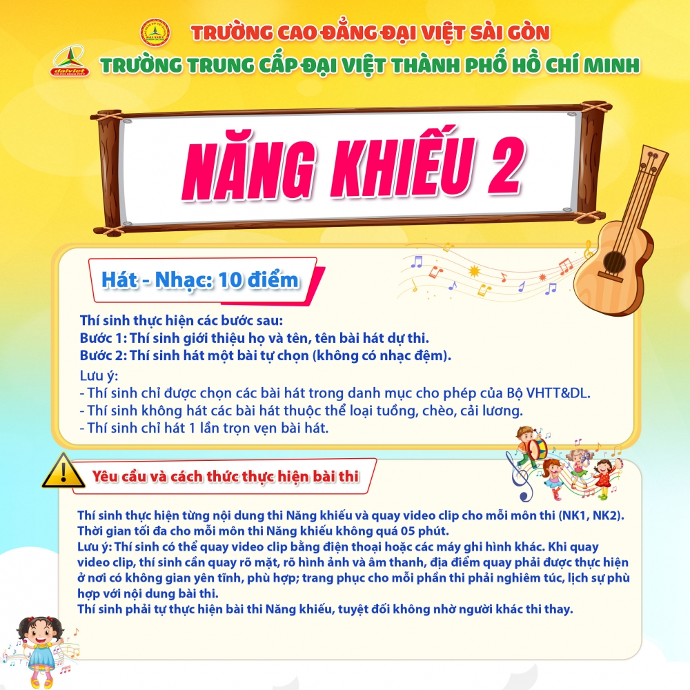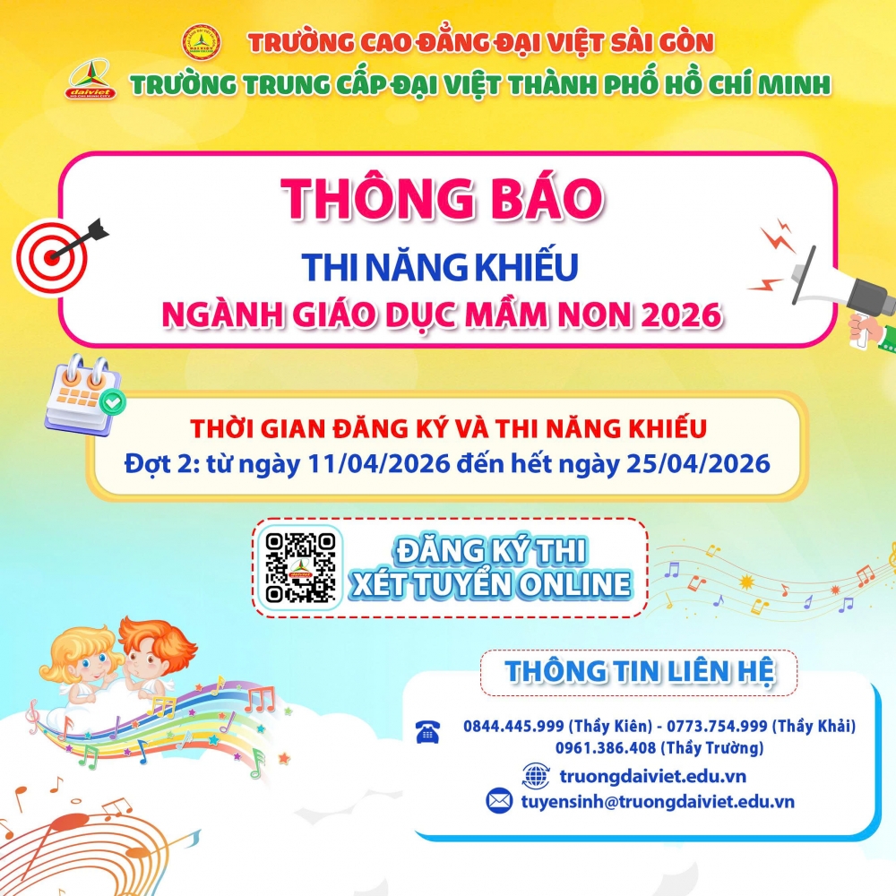 Nhằm tạo điều kiện cho các thí sinh có năng khiếu và định hướng theo học ngành Giáo dục Mầm non, Trường Cao đẳng Đại Việt Sài Gòn Cơ sở Thủ Đức thông báo mở đăng ký tham gia kỳ thi năng khiếu Mầm non năm 2026 – Đợt 2.