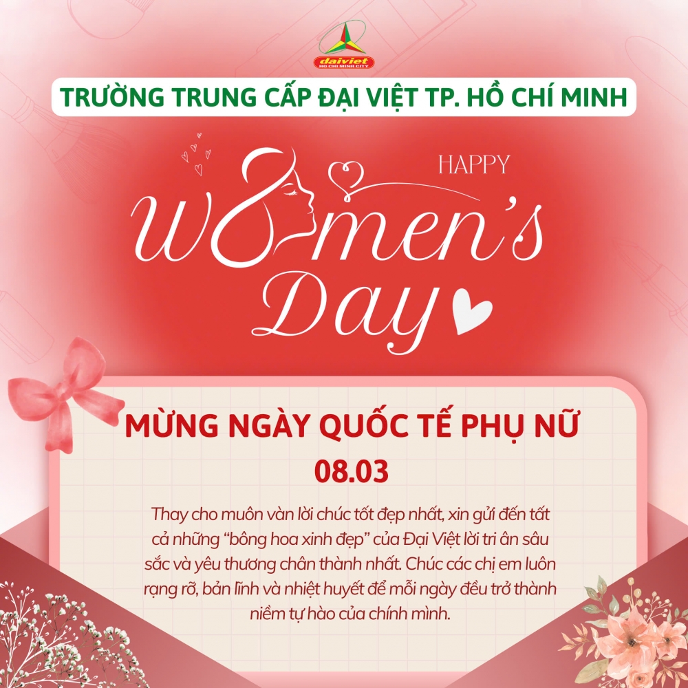 Hòa chung không khí đó, Trường Trung cấp Đại Việt TP.HCM xin gửi lời chúc mừng tốt đẹp nhất đến toàn thể nữ cán bộ, giảng viên, nhân viên và học viên của nhà trường. Kính chúc các cô, các chị và các bạn nữ luôn dồi dào sức khỏe, xinh đẹp, tự tin, thành công trong sự nghiệp và hạnh phúc viên mãn trong cuộc sống. Chúc cho "một nửa yêu thương" của Đại Việt luôn giữ vững tinh thần nhiệt huyết, không ngừng học hỏi và khẳng định tài năng, bản lĩnh của mình trong mọi lĩnh vực.