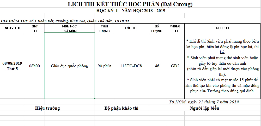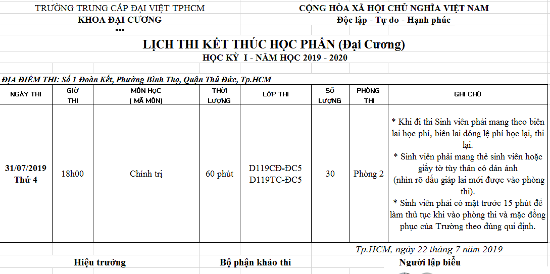 Lịch thi kết thúc học phần môn Chính trị (hệ CĐ và TC đêm) và môn GDQP (hệ TC nga)