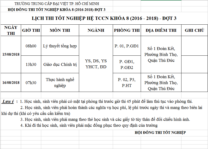 LỊCH THI TỐT NGHIỆP KHÓA 8 (2016-2018) - ĐỢT 3, NGÀY THI 15- 16/08/2018