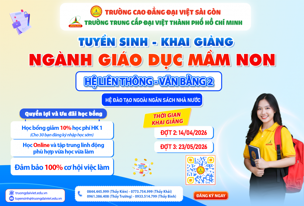 Trường Cao đẳng Đại Việt Sài Gòn Cơ sở Thủ Đức thông báo tuyển sinh và khai giảng ngành Giáo dục Mầm non năm 2026 dành cho hệ Liên thông và Văn bằng 2.