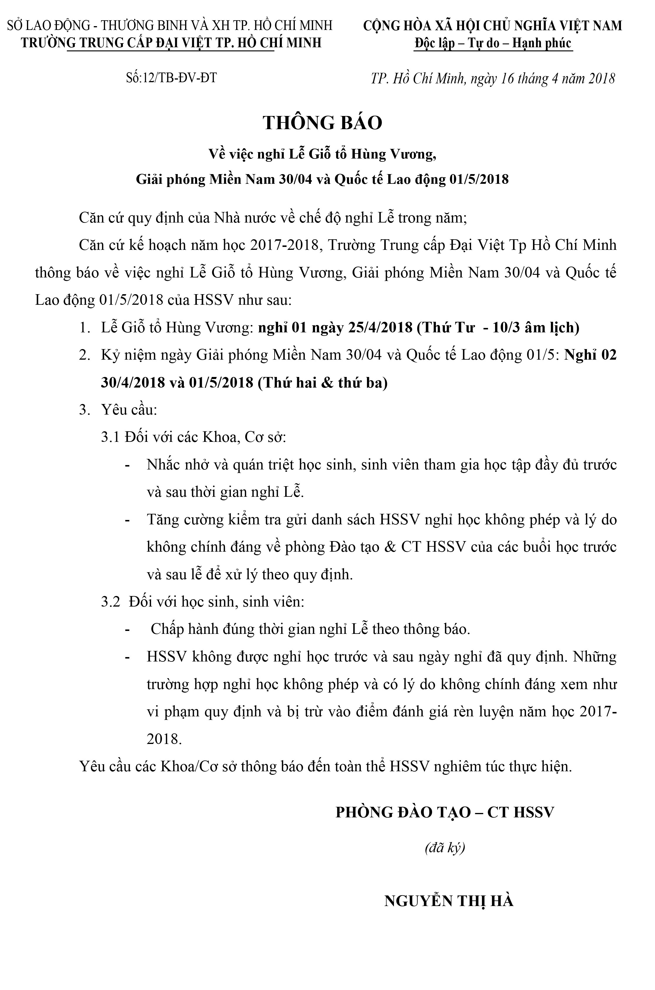 Thông báo về việc nghỉ Lễ Giỗ tổ Hùng Vương, Giải phóng Miền Nam 30/04 và Quốc tế Lao động 01/5/2018