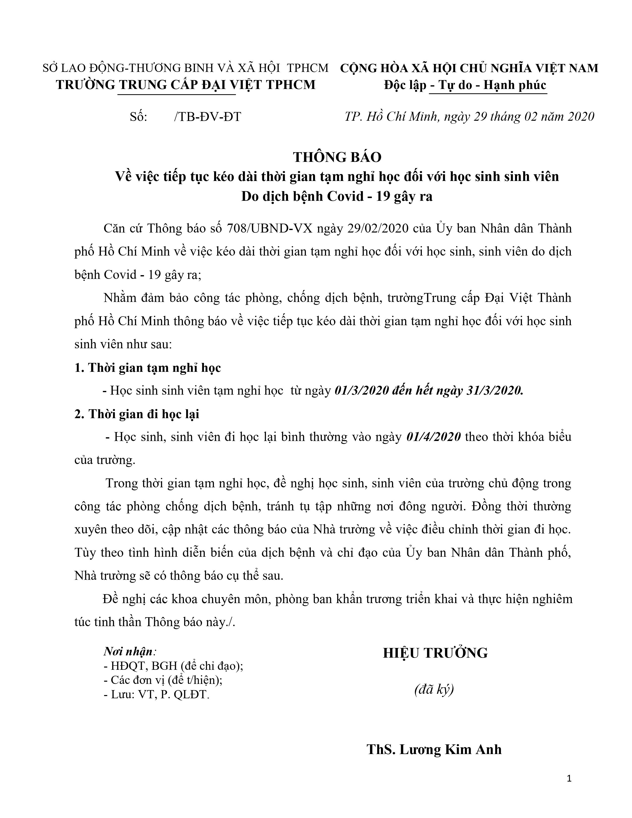 Thông báo về việc tiếp tục kéo dài thời gian tạm nghỉ học đối với học sinh sinh viên Do dịch bệnh Covid - 19 gây ra