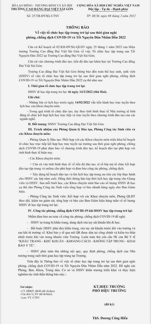 Thông báo về việc tổ chức học tập trung sau thời gian nghỉ phòng, chống dịch COVID-19 và Tết nguyên Đán Nhâm Dần 2022