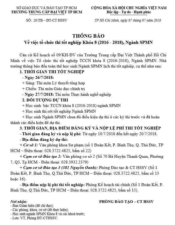 THÔNG BÁO Về việc tổ chức thi tốt nghiệp Khóa 8 (2016 - 2018), Ngành SPMN