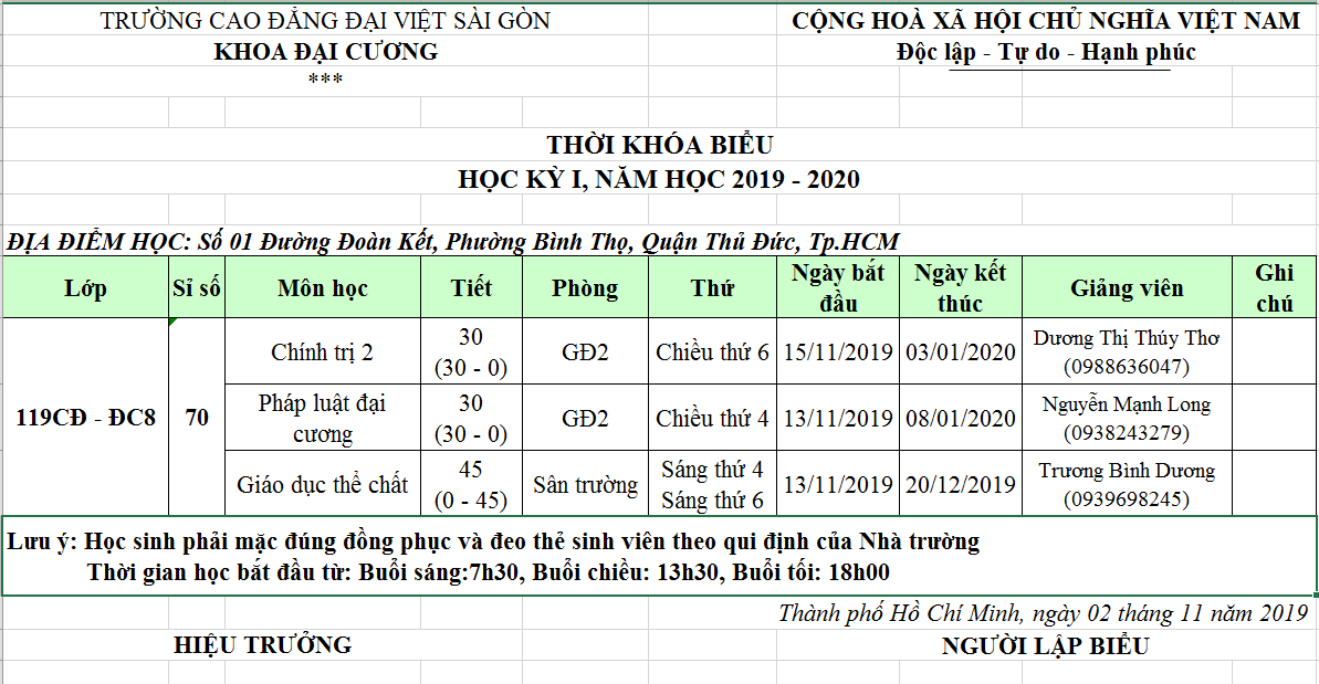 TKB môn Chính trị 2, Pháp luật đại cương, Giáo dục thể chất hệ CĐ lớp ngày
