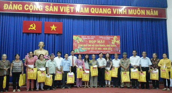 Tại buổi Họp mặt, ThS. Trần Thành Đức đã trao 50 phần quà Tết cho hộ cận nghèo, khó khăn tại Phường Linh Trung trị giá mỗi phần quà 500.000đ góp phần cùng các gia đình chuẩn bị đón một mùa xuân mới vui tươi, ấm áp nghĩa tình. Đại diện các hộ gia đình nhận quà xúc động cảm ơn sự quan tâm của Đảng ủy, Ban Giám hiệu Nhà trường đã đến tặng quà nhân dịp Tết đến, xuân về.